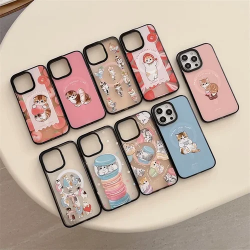 귀여운 디저트 고양이 2.0 아크릴 블랙 테두리 마그네틱 전화 케이스 커버, 아이폰 12, 13, 14, 15, 16 프로 맥스 케이스