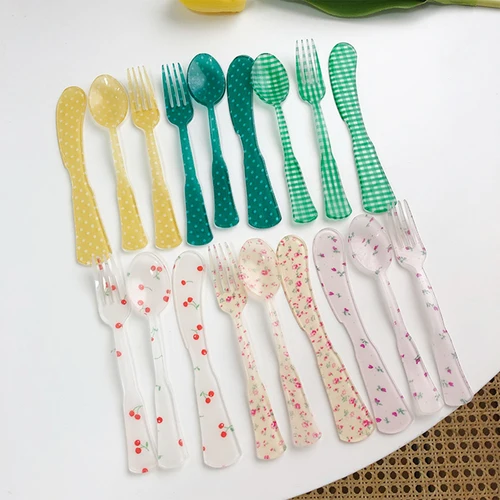 나이스 로망 빈티지 체크무늬프랑스 스타일 복고풍 격자 무늬 디저트 스푼과 포크 플라스틱 차 커피 믹싱 스푼 빈티지 음료 식기 꽃 티스푼 1 세트 귀여운 아이스크림스푼 올드패션촬영용품