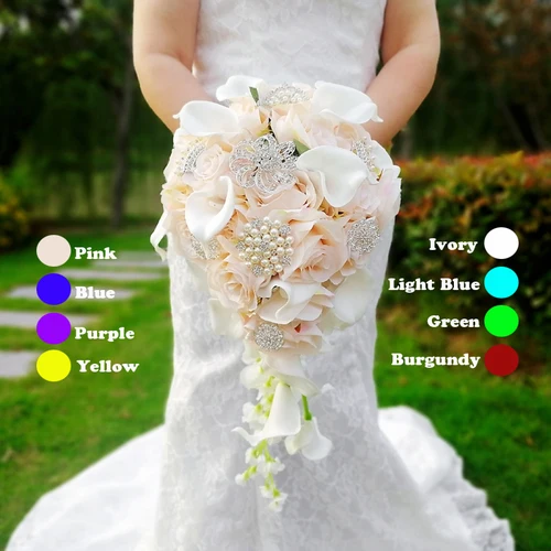 PEORCHID 화이트 플라워 로얄 블루 웨딩 부케, 리얼 터치 하이 퀄리티 칼라 백합 장미, 캐스케이딩 신부 부케, 인공
