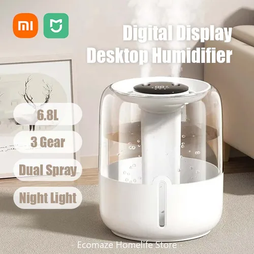 샤오미 듀얼 스프레이 가습기, 디지털 디스플레이 야간 조명 음소거 USB, 가정용 데스크탑 항균 정화 가습기, 6800 ML