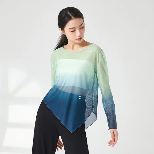 여성용 클래식 댄스 의상 탑 메쉬 얇은 명주 그물 셔츠, 그라데이션 컬러, 불규칙한 밑단 슬림 크루넥 블라우스, 모던 퍼포먼스 의상