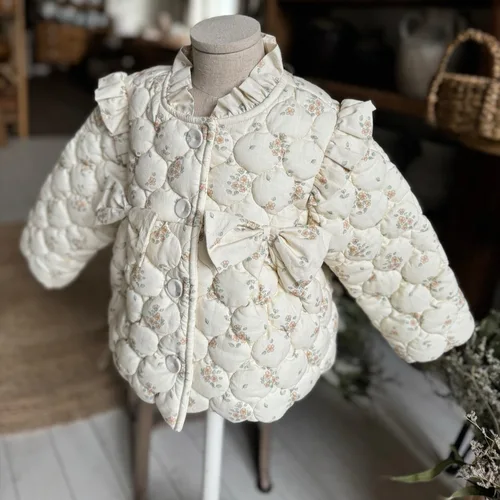 여아용 긴 소매 플리스 플로럴 코트, 달콤한 활 여아 패딩 재킷, 벨벳 두꺼운 유아 따뜻한 옷, 2025 겨울 신상